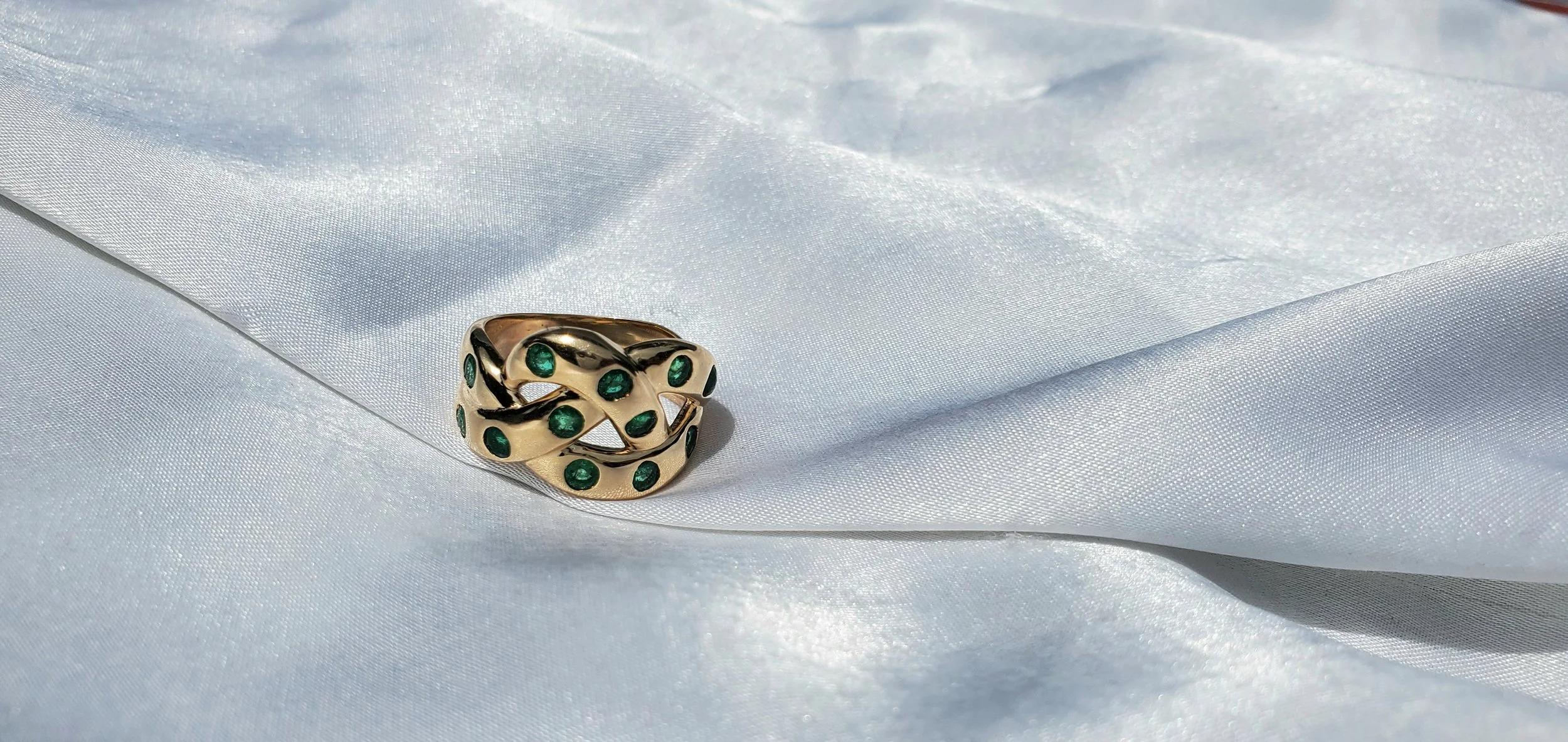 18k gold pretzel knotted ring with emeralds. .